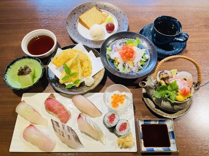 自家製ドレッシングのサラダ・小鉢・天婦羅・お寿司8種・松茸の土瓶蒸し・デザート・コーヒー